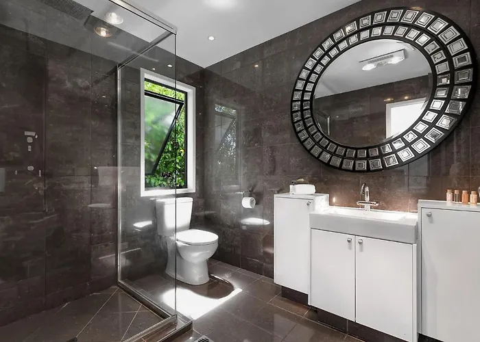Die Villa 2 Luna Noosa - Spacious Retreat In Elevated Location verfügt über ein Badezimmer mit einer begehbaren Dusche, einer getrennten Toilette und einer Waschmaschine. Ein Haartrockner werden auch angeboten.